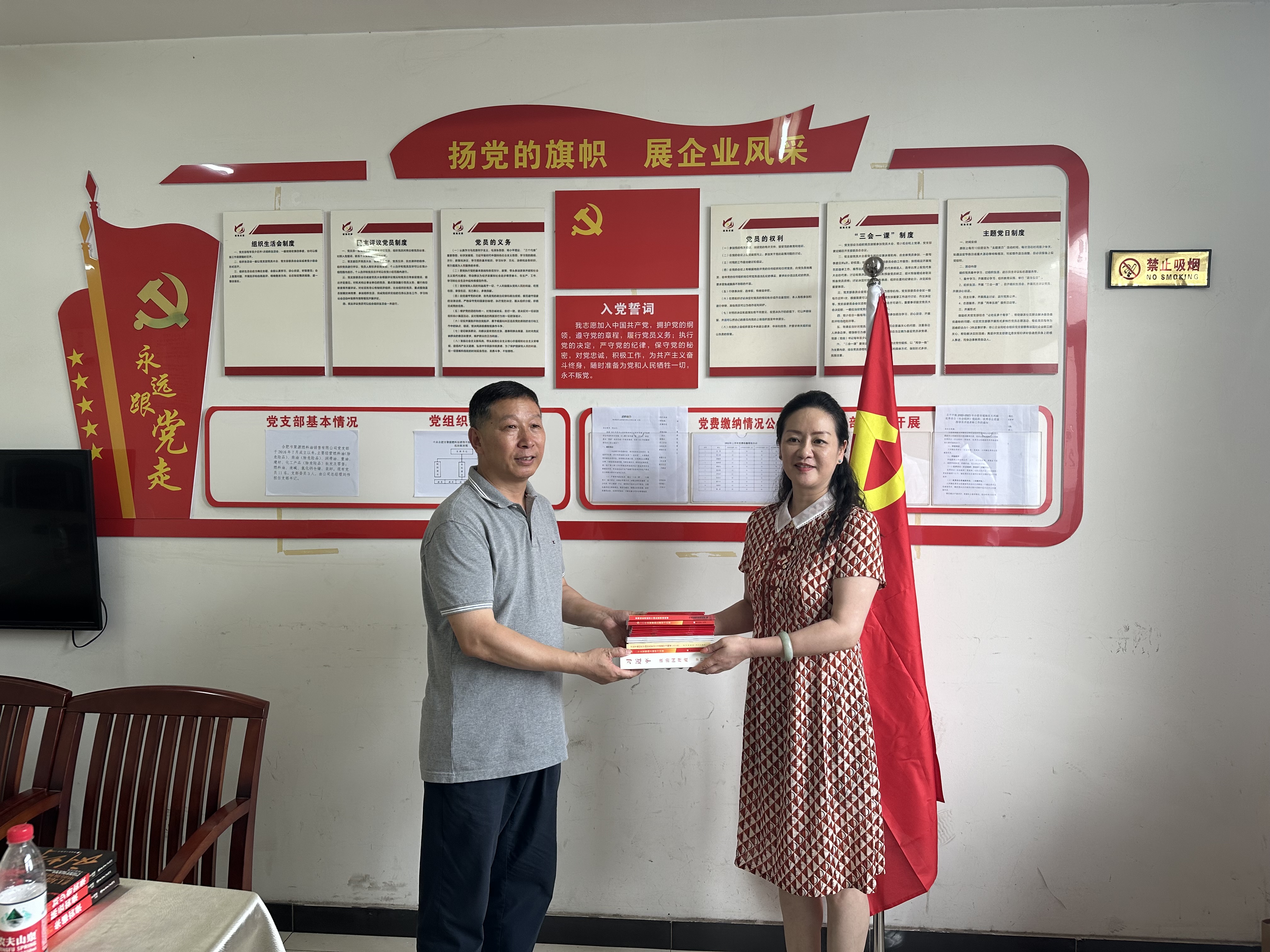 隨后,雙方黨支部書記相互交換了精心準備的黨建書籍,在合肥聚源燃料油銷售有限公司黨支部書記的帶領下,全體黨員一同面向黨旗重溫入黨誓詞。